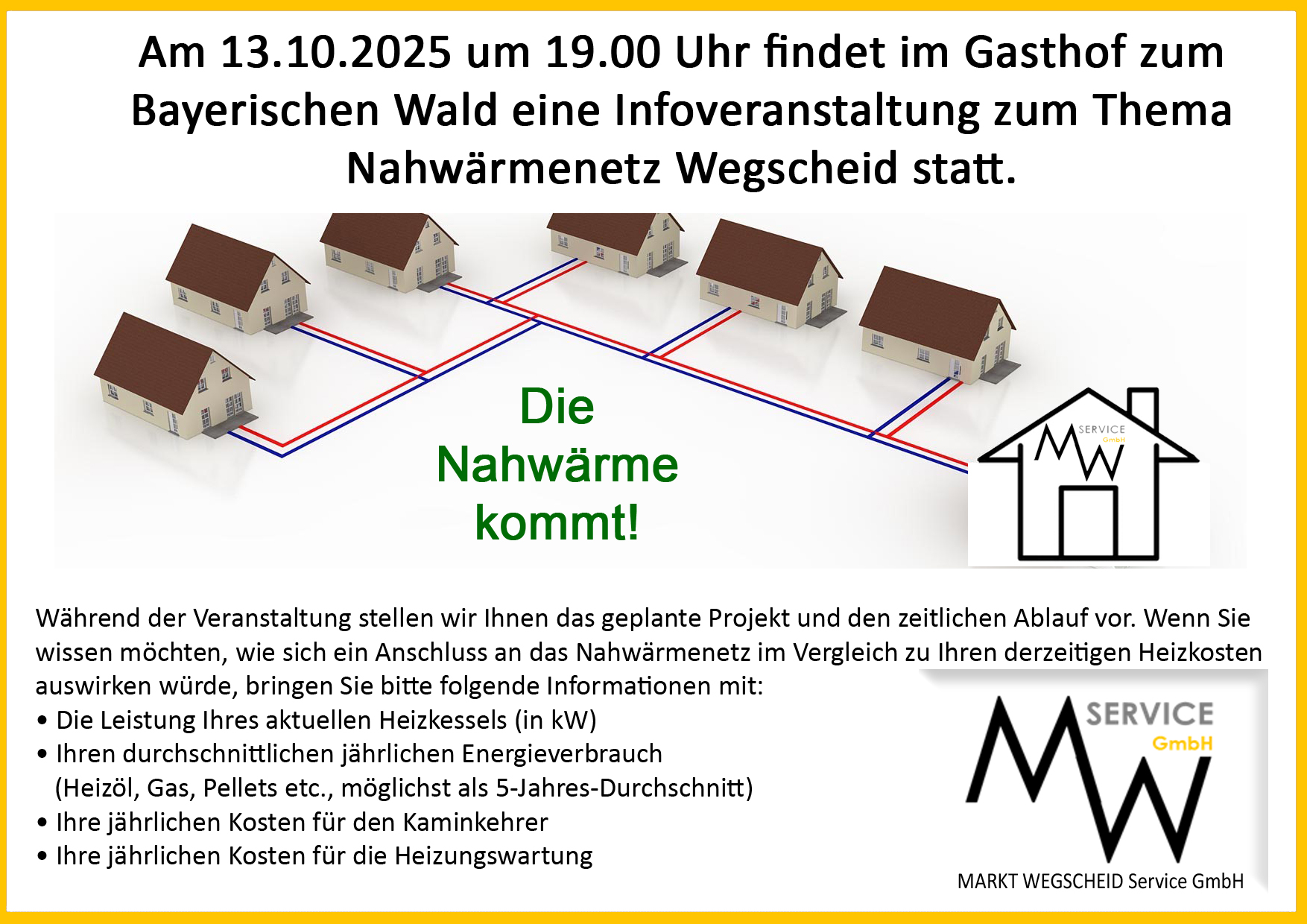 Die "MARKT WEGSCHEID Service GmbH" informiert über den aktuellen Stand des geplanten Nahwärmenetzes. Alle interessierten Bürgerinnen und Bürger sind herzlich zur Infoveranstaltung eingeladen.