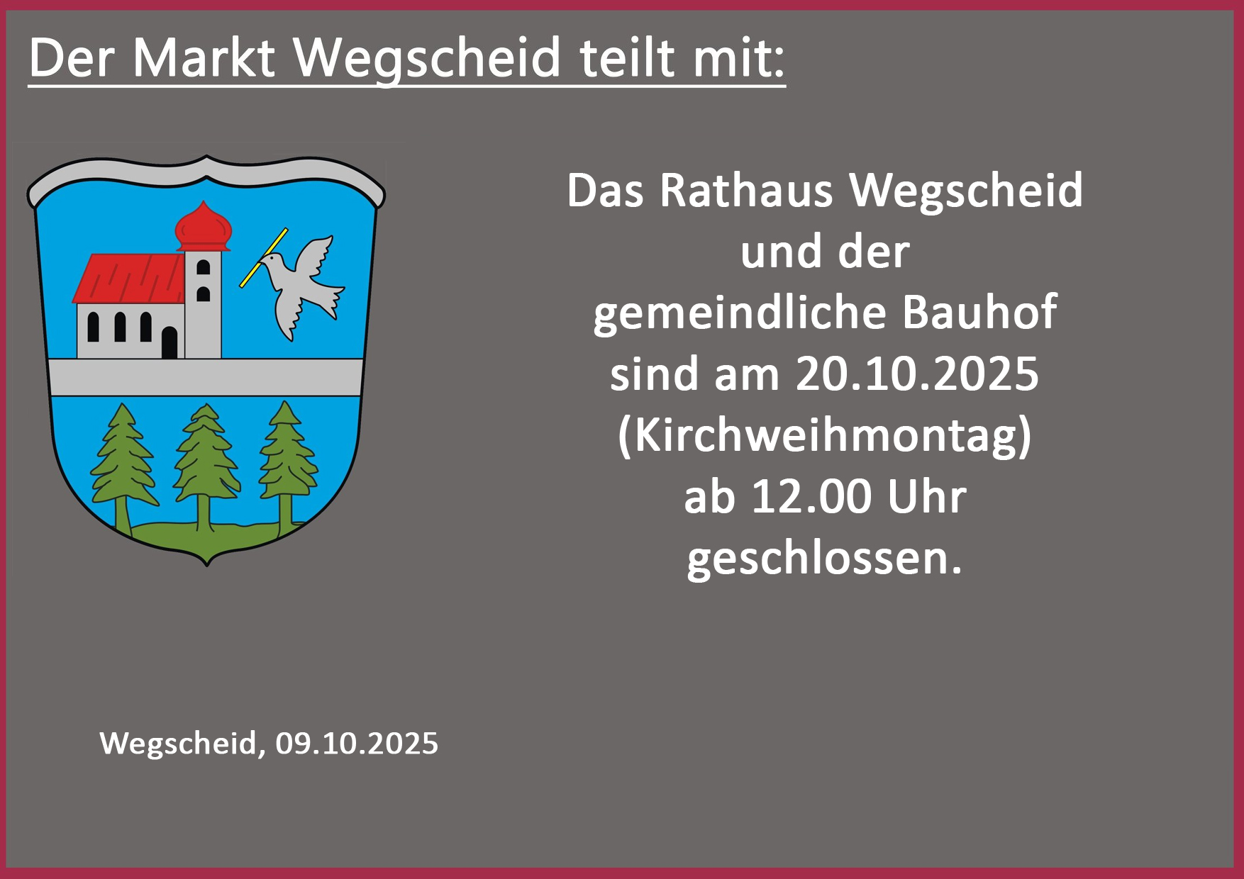 Das Rathaus Wegscheid und der gemeindliche Bauhof sind am 20.10.2025 (Kirchweihmontag) ab 12.00 Uhr geschlossen.