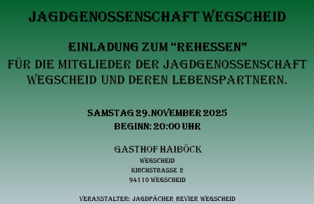 Die Revierpächter Wegscheid laden Mitglieder und deren Lebenspartner herzlich zum diesjährigen Rehessen ein!