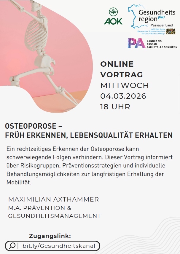 Am 04.03.2026 können Sie um 18.00 Uhr am kostenlosen Online-Vortrag zum Thema Osteoporose teilnehmen.