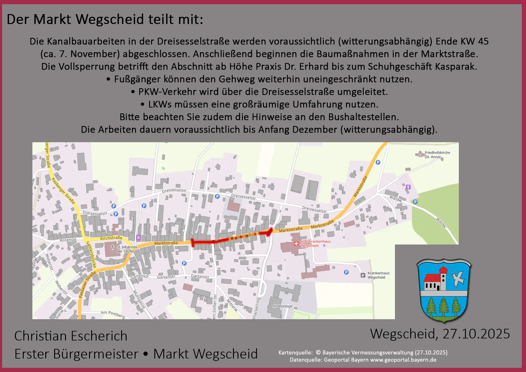 Die Kanalbauarbeiten in der Dreisesselstraße werden voraussichtlich (witterungsabhängig) Ende KW 45 (ca. 7. November) abgeschlossen. Anschließend beginnen die Baumaßnahmen in der Marktstraße. Die Vollsperrung betrifft den Abschnitt ab Höhe Praxis Dr. Erhard bis zum Schuhgeschäft Kasparak.
