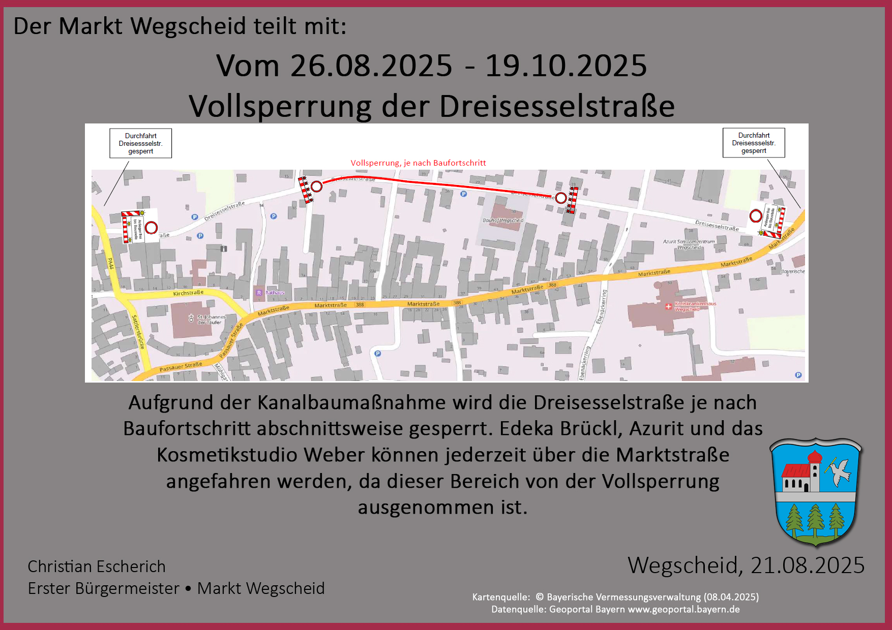 Edeka Brückl, das Altenheim Azurit und das Kosmetikstudio von Claudia Weber können jederzeit angefahren werden. Bitte nutzen Sie hierzu die Zufahrten von der Marktstraße kommend.